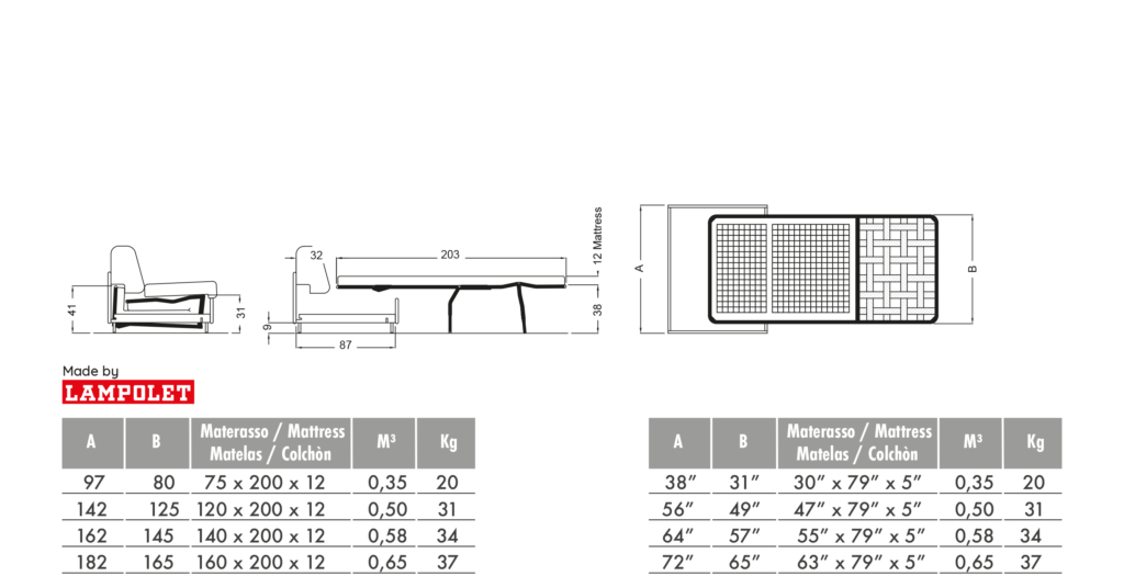 and bed base. In 87 cm of depth it can contain a 12×200 cm