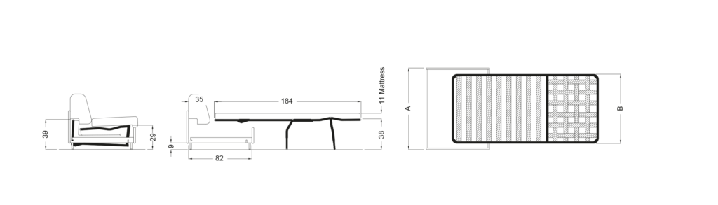 foam 8/10/11×182 cm. Seat with elastic straps. Optional: Feet H 9 cm.